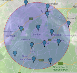 The map below shows the 10 mile radius from our business address in Bordon. We will be charge to travel to a home address outside of this radius.